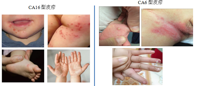CA16型皮疹集中于手、足、口、臀,多为斑丘疹或疱疹,液体少、无痛痒,发热无特殊规律;CA6型皮疹更广,波及膝盖、肘部及躯干,以硬斑丘疹为主,伴疼痛痒感,可能出现大疱,发热多为中低热,痊愈后偶有脱甲。