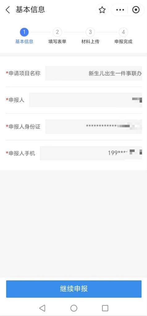 3、选择对应情形后,点击“立即办理”进入基本信息页面,基本信息为系统自动带出,确认无误后点击“继续申报”。