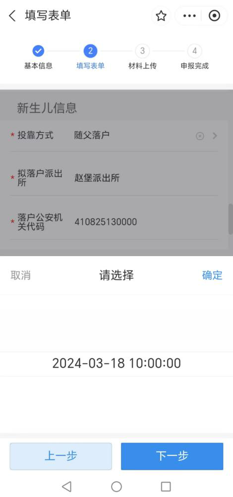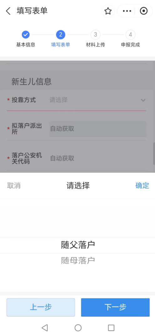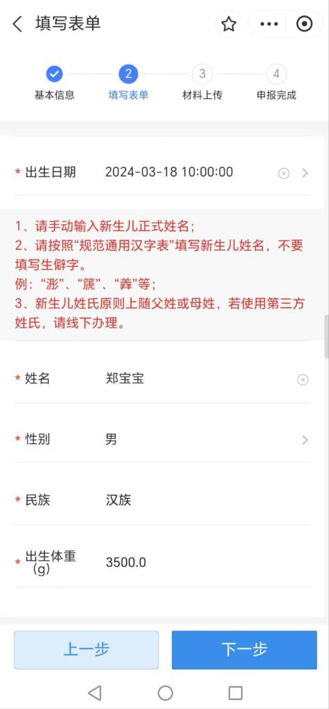 (3)选择新生儿落户投靠方式,系统自动获取新生儿拟落户派出所信息。选择新生儿出生日期,系统自动获取新生儿的出生体重、孕周等相关信息,您只需要填写新生儿姓名即可。
