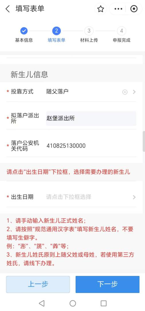 2、新生儿落户必须随父母中河南户籍一方,集体户口、父母所属民族不一致、非婚内出生的新生儿暂不支持一件事联办。
