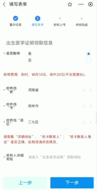 (4)填写出生医学证明领取信息,选择是否邮寄,若您选择邮寄,请填写出生医学证明邮寄的省、市、县,收件详细地址,收卡人姓名和电话。