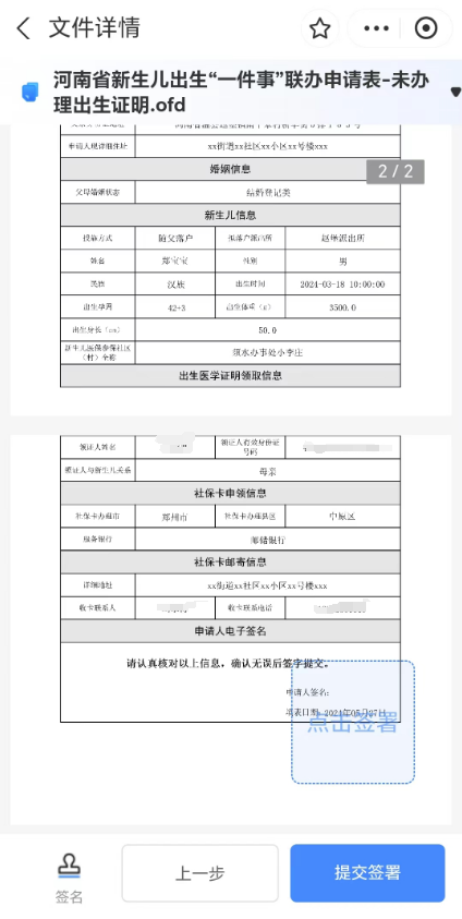 (9)表单填写完成后,点击“下一步”,系统将自动生成联办申请表和《医学出生证明》首次签发登记表,请您认真核对信息,确认无误后进行电子签名,签署成功后完成申报。