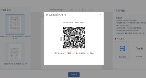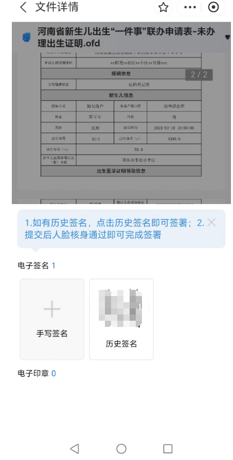9.申请人申请完成后,申请人的配偶于一个自然日内登录“豫事办”App或支付宝小程序,在“我的-我的签名”待签署页面点击“电子签名”,对《医学出生证明》首次签发登记表进行电子签名。