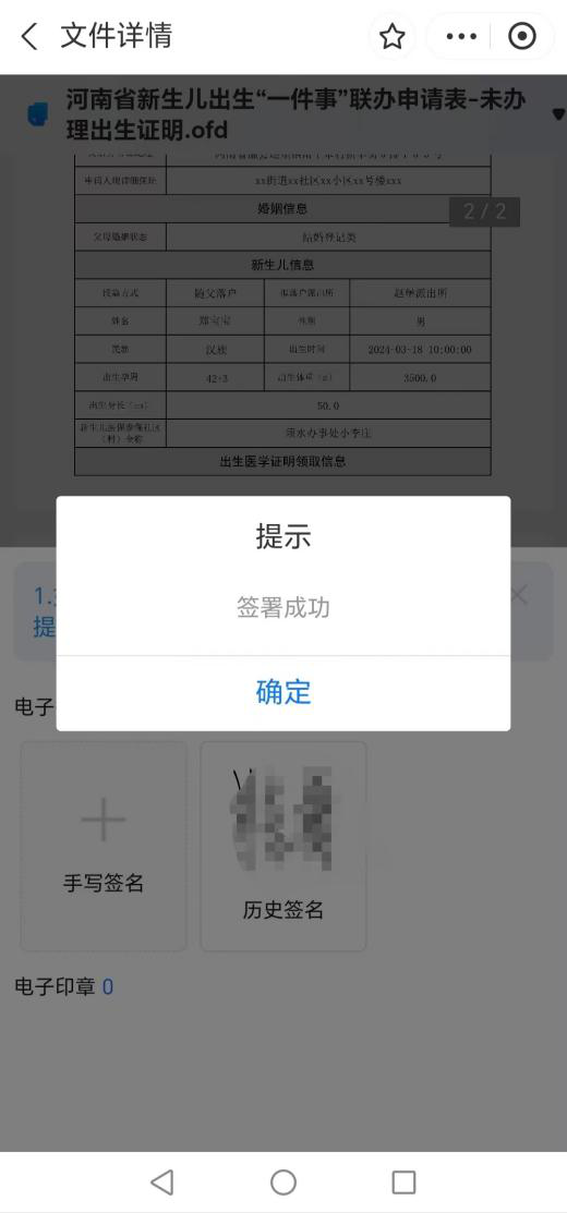 12、申请人申请完成后,申请人的配偶于一个自然日内登录“豫事办”App或支付宝小程序,在“我的-我的签名”待签署页面点击“电子签名”,对《医学出生证明》首次签发登记表进行电子签名(签名方式与申请人签名方式相同)。