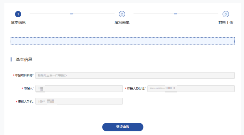 4、选择对应情形后,点击“立即办理”进入基本信息页面,基本信息为系统自动带出,确认无误后点击“继续申报”。