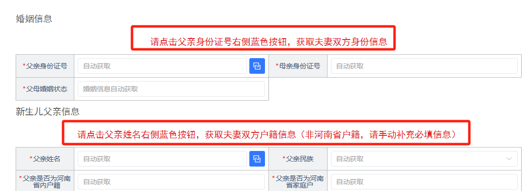 答:先点击父亲身份证号右侧蓝色按钮,获取夫妻双方信息,再点击父亲姓名右侧蓝色按钮获取夫妻双方户籍信息,如果有一方非河南省户籍,需要手动规范填写必填信息。